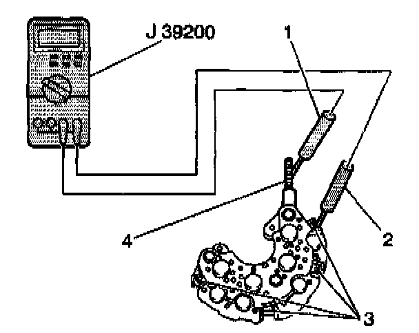 7. Measure the resistance between the rectifier positive terminal (4) and each rectifier terminal (3) with the J 39200. Reverse the probes and measure the resistance again. If the resistance is not less than 5 ohms in one measurement and greater than 5 ohms in the other measurement, replace the rectifier.
