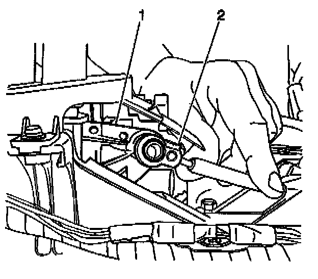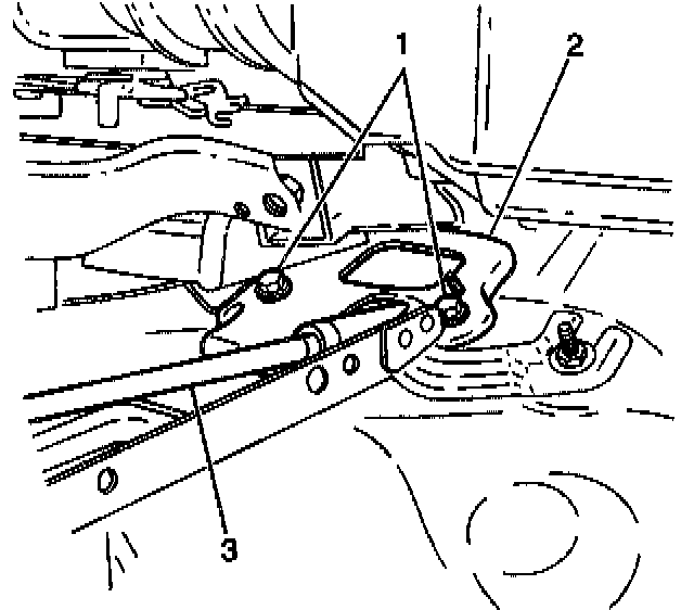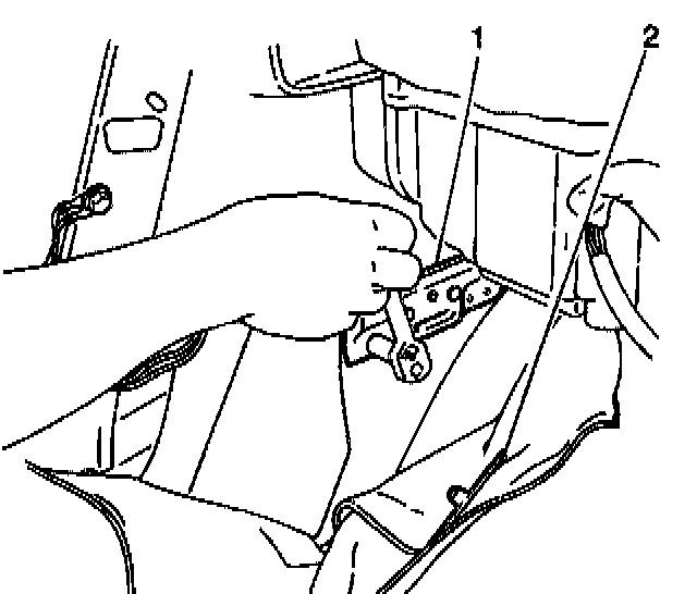 17. Remove 2 bolts (1) from the inner shift select cable grommet retainer (2). Remove the shift select cable from the vehicle through passenger compartment side of bulkhead.