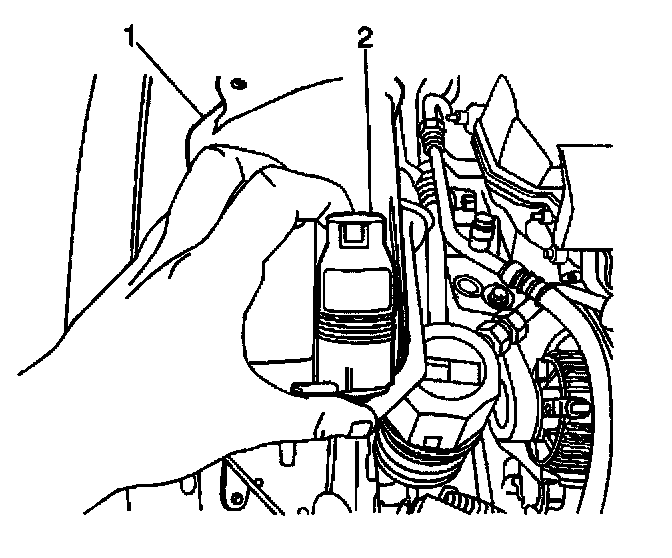 4. Install the washer solvent container (1) to the vehicle. Secure the container with the bolt (2).