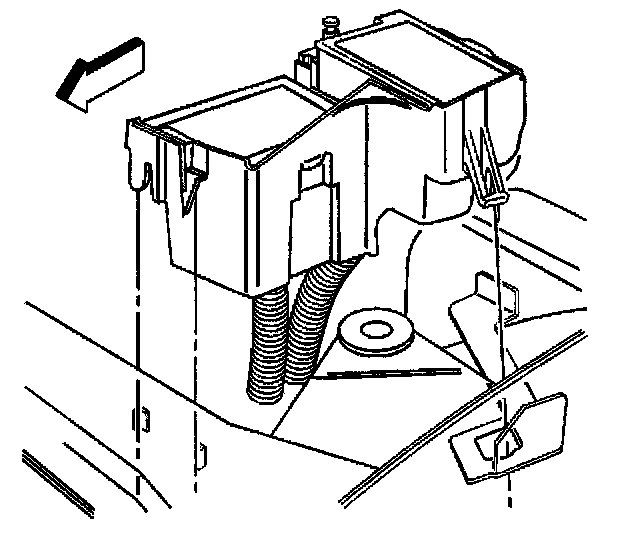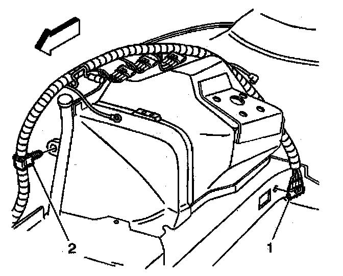 27. Tuck the harness into the opening forward of the battery tray (1).