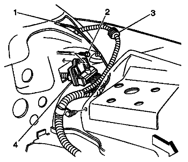 Tighten the forward lamp wiring harness grommet bolt (2) to 2 N.m (18 lb in).