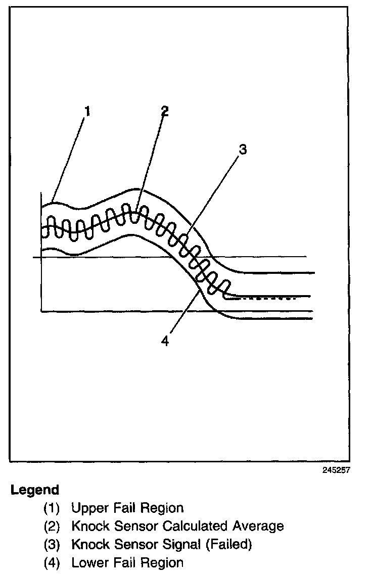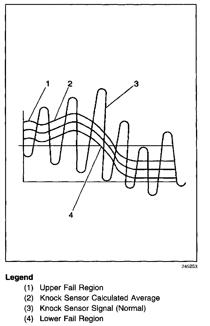 The PCM contains integrated Knock Sensor (KS) Diagnostic Circuitry. Input signals from the knock sensors are used to detect engine detonation, allowing the PCM to retard Ignition Control (IC) spark timing based on the amplitude and frequency of the KS signal being received. The knock sensors produce an AC signal under all engine operating conditions. The PCM calculates an average voltage of each knock sensor's signal and takes instantaneous signal voltage readings. The PCM uses the instantaneous signal voltage readings to determine the state of the knock sensor circuitry. If the knock sensor system is operating normally, the PCM should monitor instantaneous KS signal voltage readings varying outside a voltage range above and below the calculated average voltage (as shown in the normal knock sensor figure). If the PCM detects a knock sensor signal voltage within the calculated average voltage range, DTC P0327 or P0332 will set (as shown in the abnormal knock sensor figure).