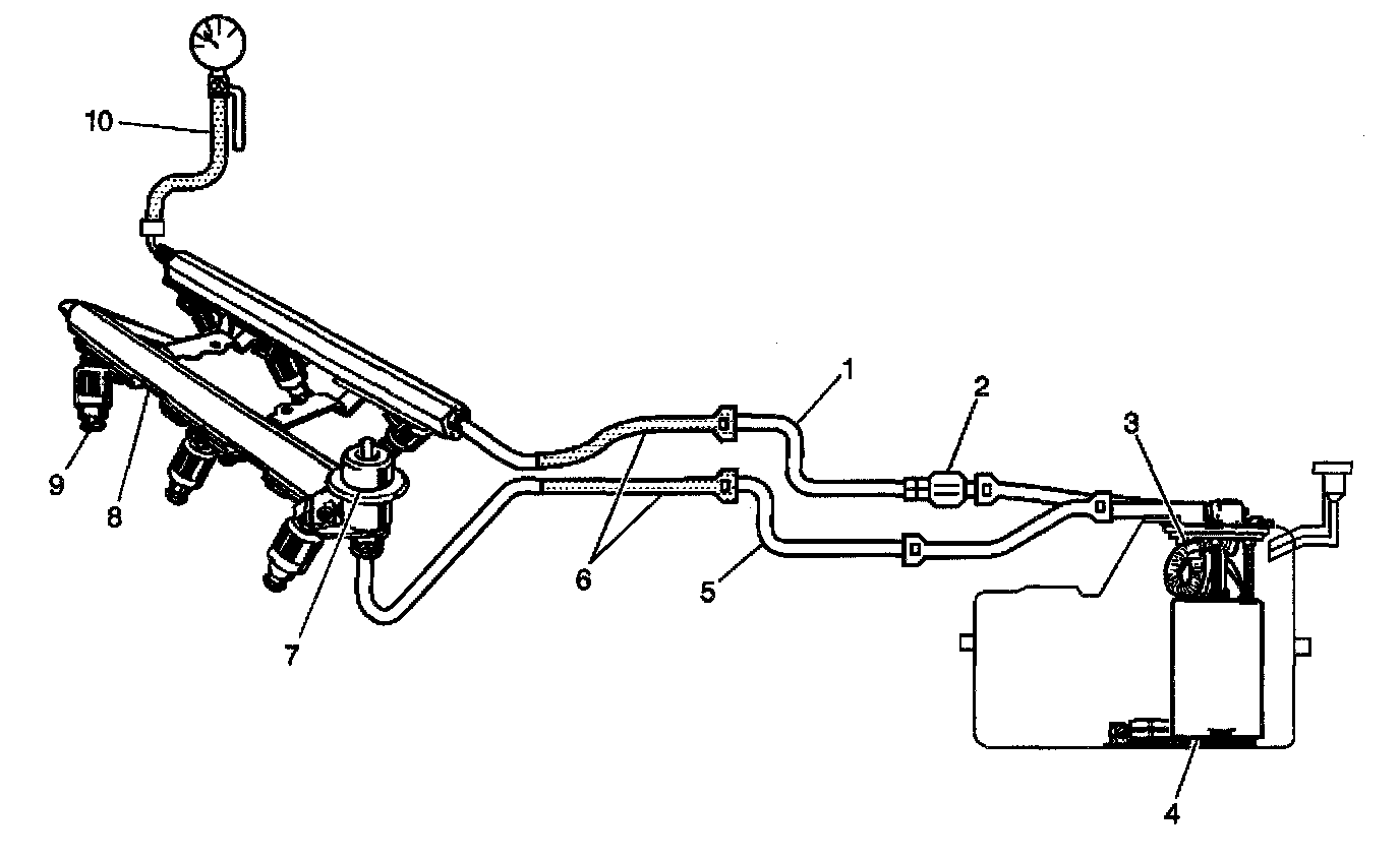 When the ignition is turned ON, the Powertrain Control Module (PCM) will turn ON the in-tank fuel pump. The in-tank fuel pump will remain ON as long as the engine is cranking or running and the PCM is receiving reference pulses. If there are no reference pulses, the PCM will turn the in-tank fuel pump OFF 2 seconds after the ignition switch is turned ON or 2 seconds after the engine stops running. The in-tank fuel pump is an electric pump within an integral reservoir (4). The in-tank fuel pump supplies fuel through the fuel feed pipe (1), and in-line fuel filter (2) to the fuel rail assembly (8). The fuel pump is designed to provide fuel at a pressure above the pressure needed by the fuel injectors (9). A fuel pressure regulator (7), attached to the fuel rail, keeps the fuel available to the fuel injectors at a regulated pressure. Unused fuel is returned to the fuel tank by a separate fuel return pipe (5). The fuel pump flex pipe (3) functions as a conduit for transporting pressurized fuel from the fuel pump to the above cover fuel feed pipe. The fuel pump flex pipe also eliminates fuel pump generated pressure pulse noise, and eliminates clamps formerly needed for rubber hoses or nylon pipes. The fuel pressure gauge J 34730-1A (10). The fuel pipe return and feed hose assemblies are the pinch points used during the fuel system pressure test (6).