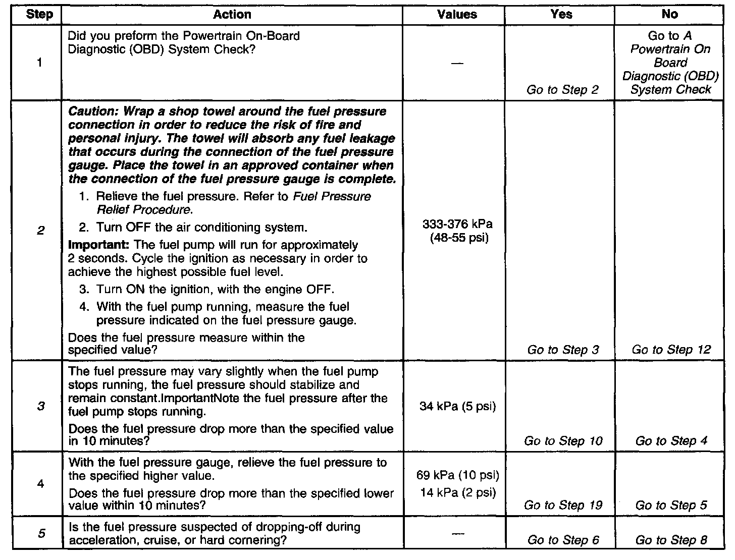 15. A lean condition may result from the fuel pressure being below 333 kPa (48 psi). A lean condition may cause a DTC P0131 or a DTC P0171 to set. Driveability conditions associated with lean conditions can include hard starting (when the engine is cold), hesitation, poor driveability, lack of power, surging, and misfiring.