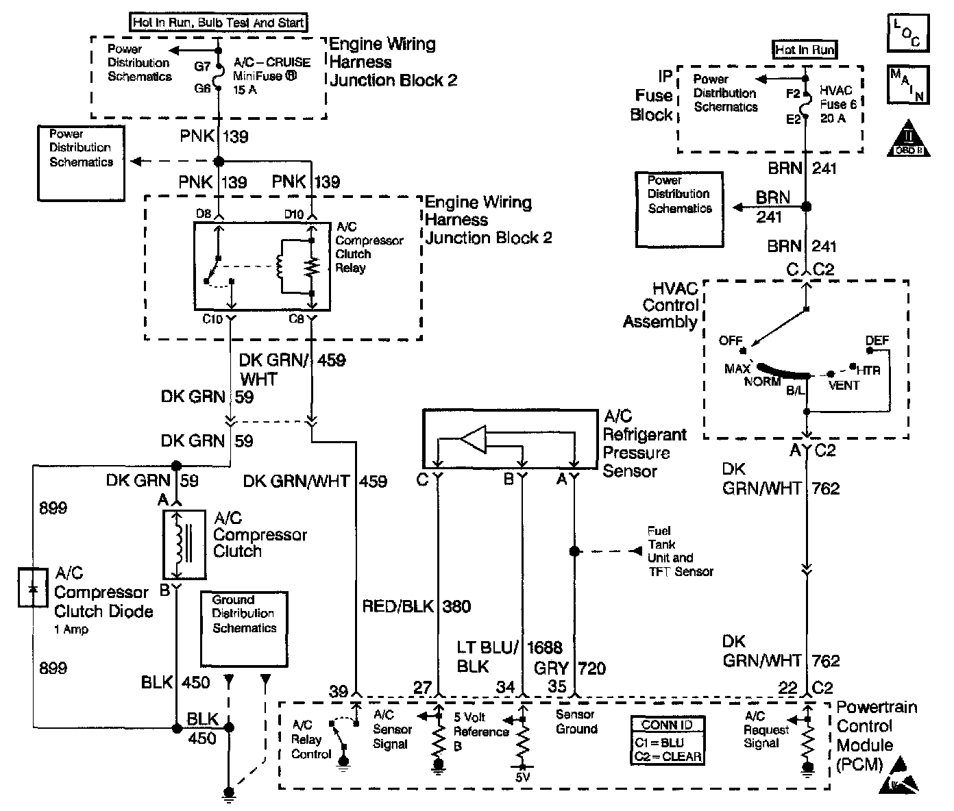 When an A/C mode is selected, the HVAC control head supplies a battery positive voltage signal to the PCM A/C request input. The A/C compressor clutch relay is controlled by the PCM. The PCM provides a ground path for the A/C relay coil. When the A/C compressor relay is engaged battery positive voltage is supplied to the compressor clutch coil. The PCM will enable the A/C compressor clutch whenever the engine is running and the A/C has been requested unless one or more of the following conditions are present:
