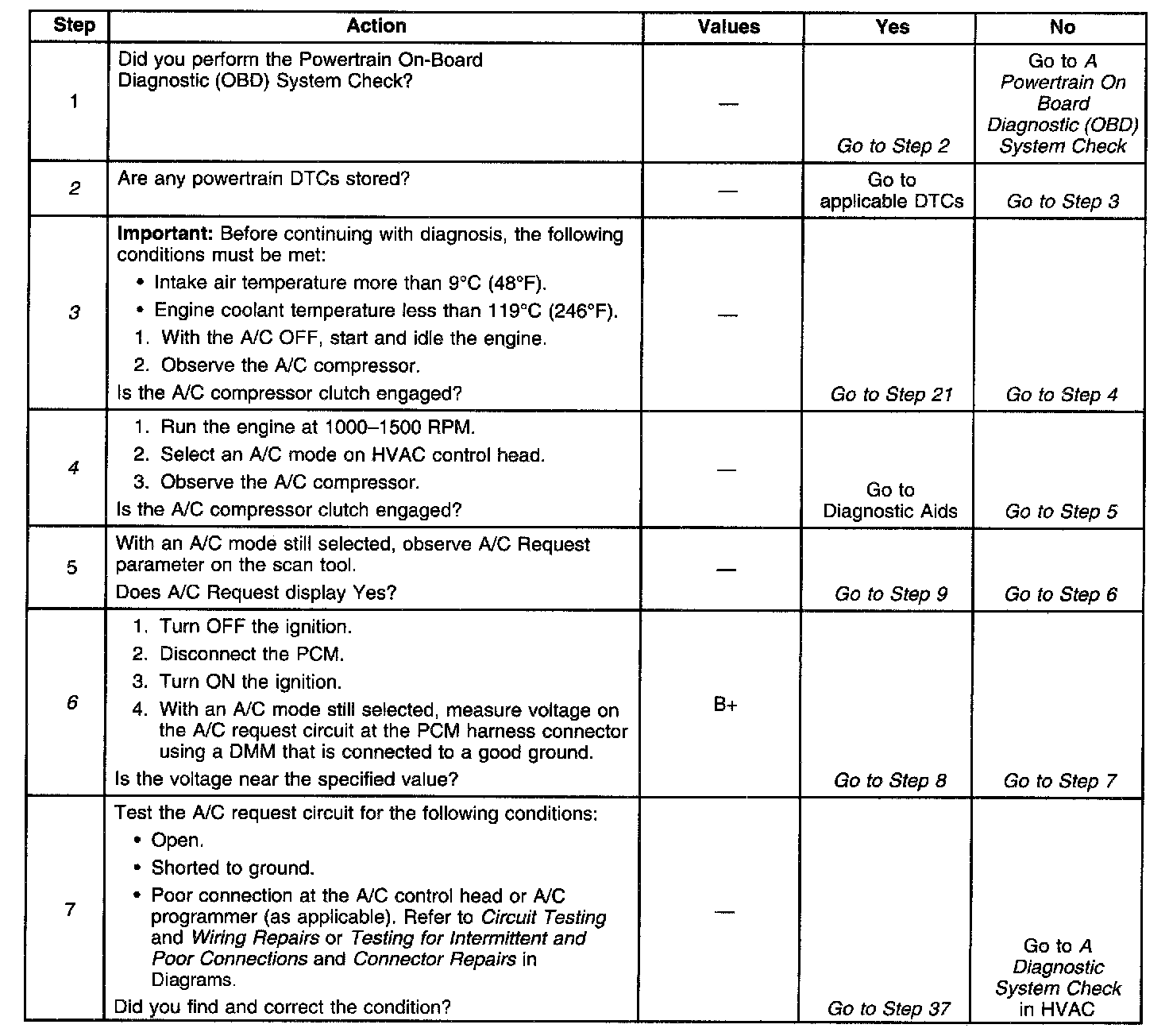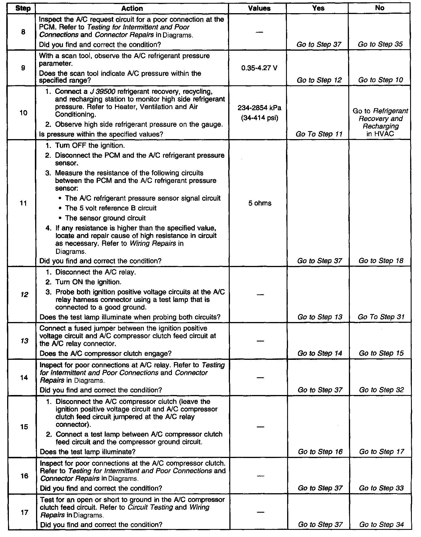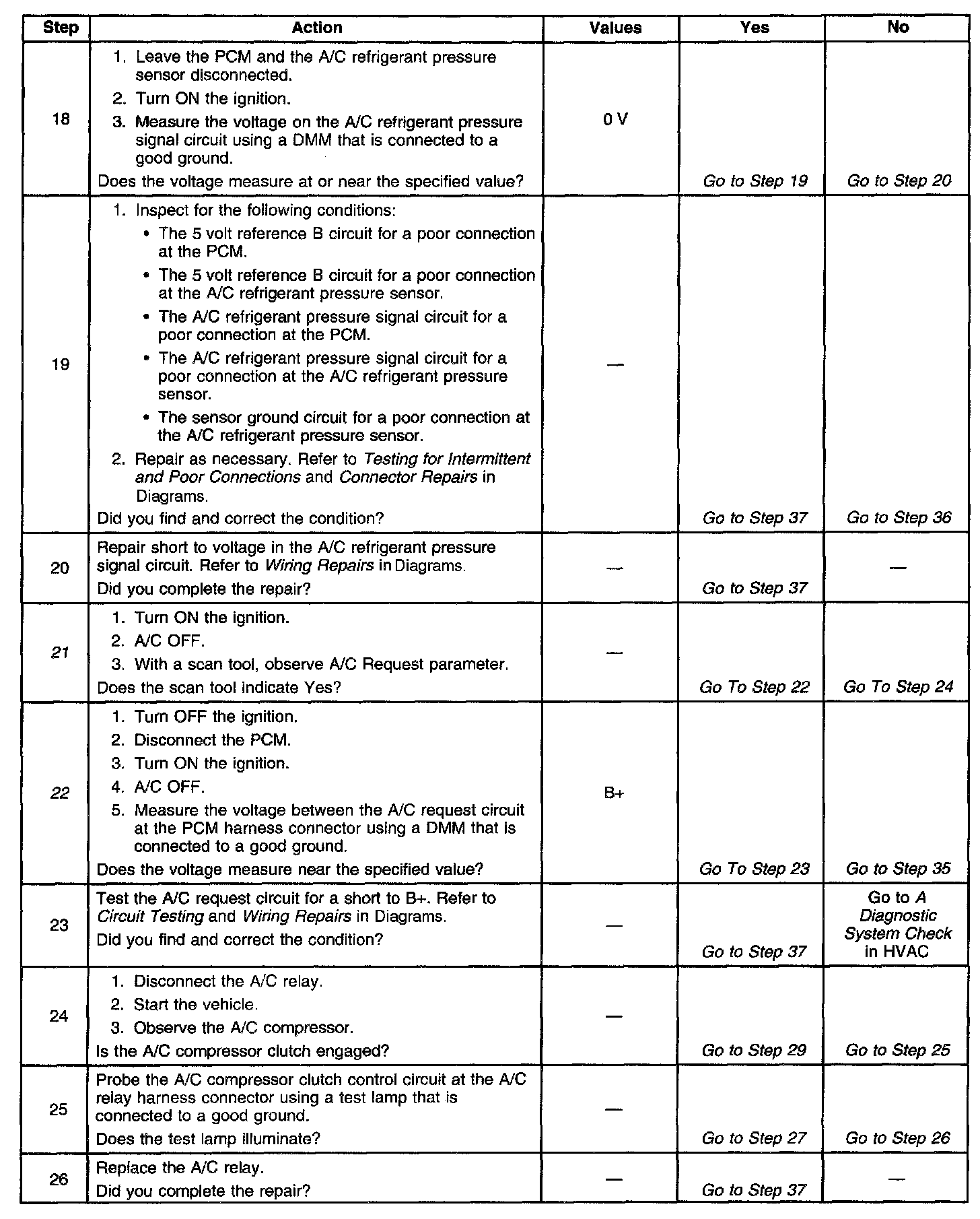 2. Stored diagnostic trouble codes may disable the A/C compressor. This diagnostic table may lead to improper diagnosis and replacement of good parts if diagnostic trouble codes are present.