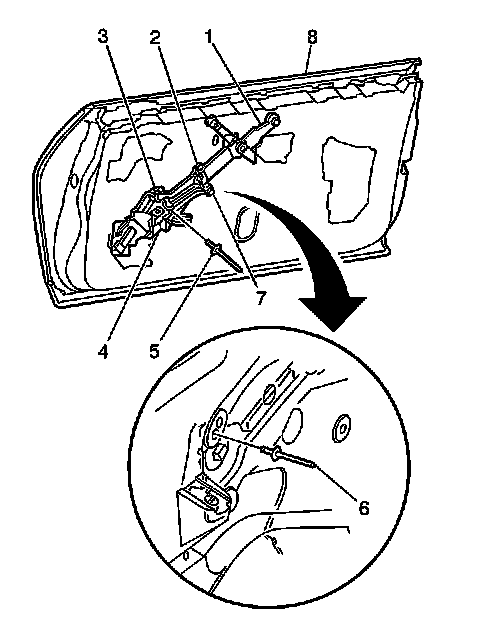 1. Install the window regulator with the regulator motor through the rear access hole. (1)
