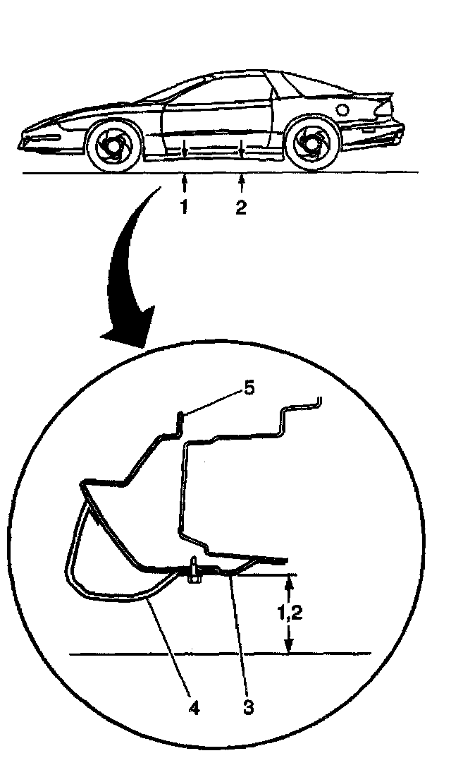 1. Calculate the trim heights (1, 2) as measured at the inner edge of the side rocker panels (3) to the ground after each jounce/rebound cycle. Record your measurement.