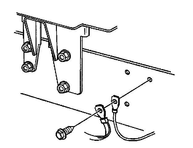 4. Remove the wiring harness ground bolt and RF ground strap and cruise control ground lead from the frame rail.