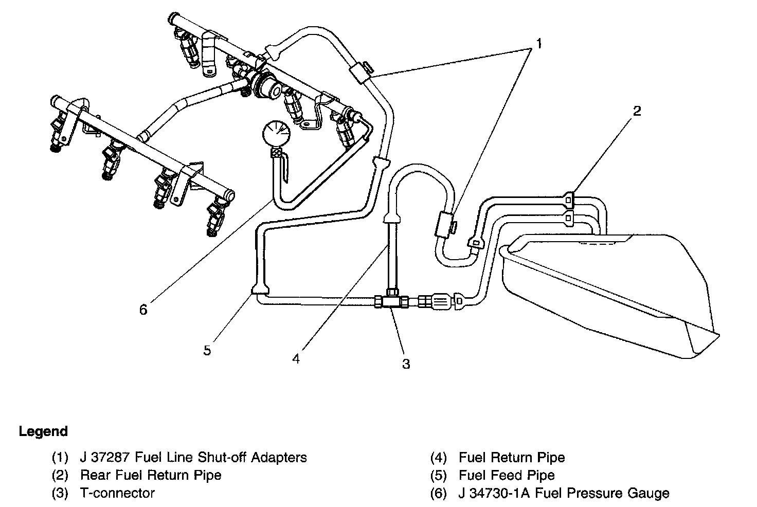 13. Restricting the fuel return pipe with the J 37287 fuel pipe shut-off adapter causes the fuel pressure to rise above the regulated fuel pressure. Using a scan tool to pressure the fuel system, the fuel pressure should rise above 410 kPa (60 psi) as the valve on the fuel pipe shut-off adapter connected to the fuel return pipe becomes partially closed.