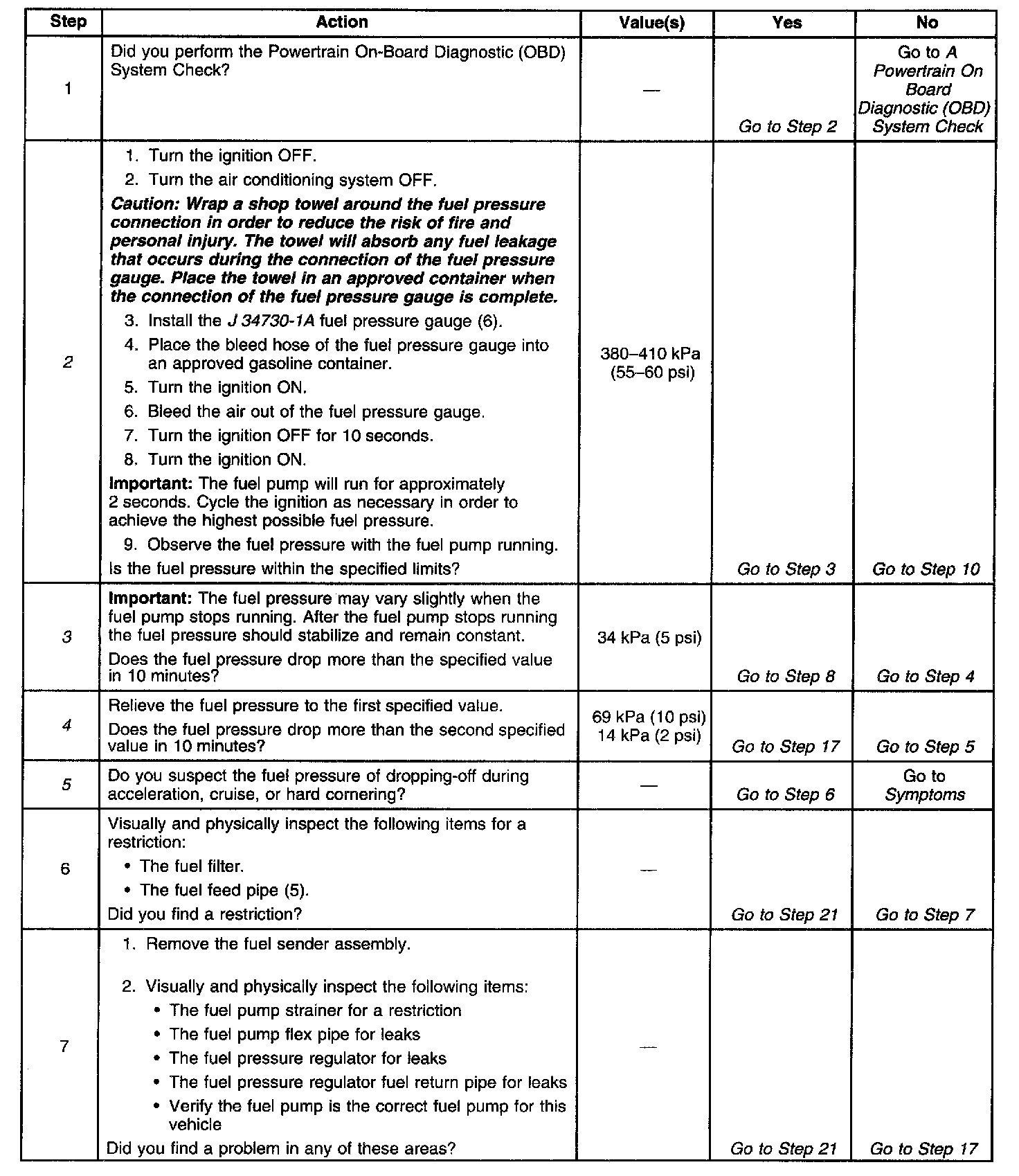 12. A lean condition may result from the fuel pressure being below 380 kPa (55 psi). A lean condition may cause DTC P0131, DTC P0151, DTC P0171 or DTC P0174 to set. Driveability conditions associated with lean conditions can include hard starting (when the engine is cold), hesitation, poor driveability, lack of power, surging, and misfiring.