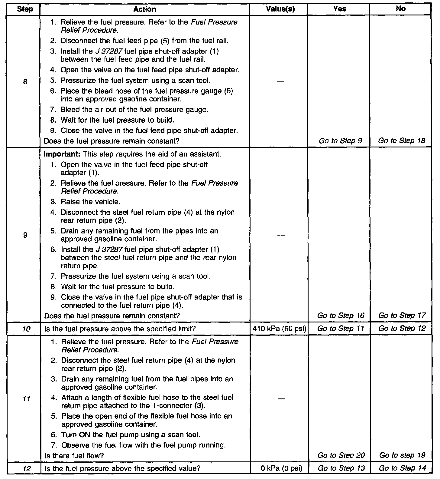 4. A fuel system that drops more than 14 kPa (2 psi) in 10 minutes after being relieved to 69 kPa (10 psi) indicates a leaking fuel pump check valve.