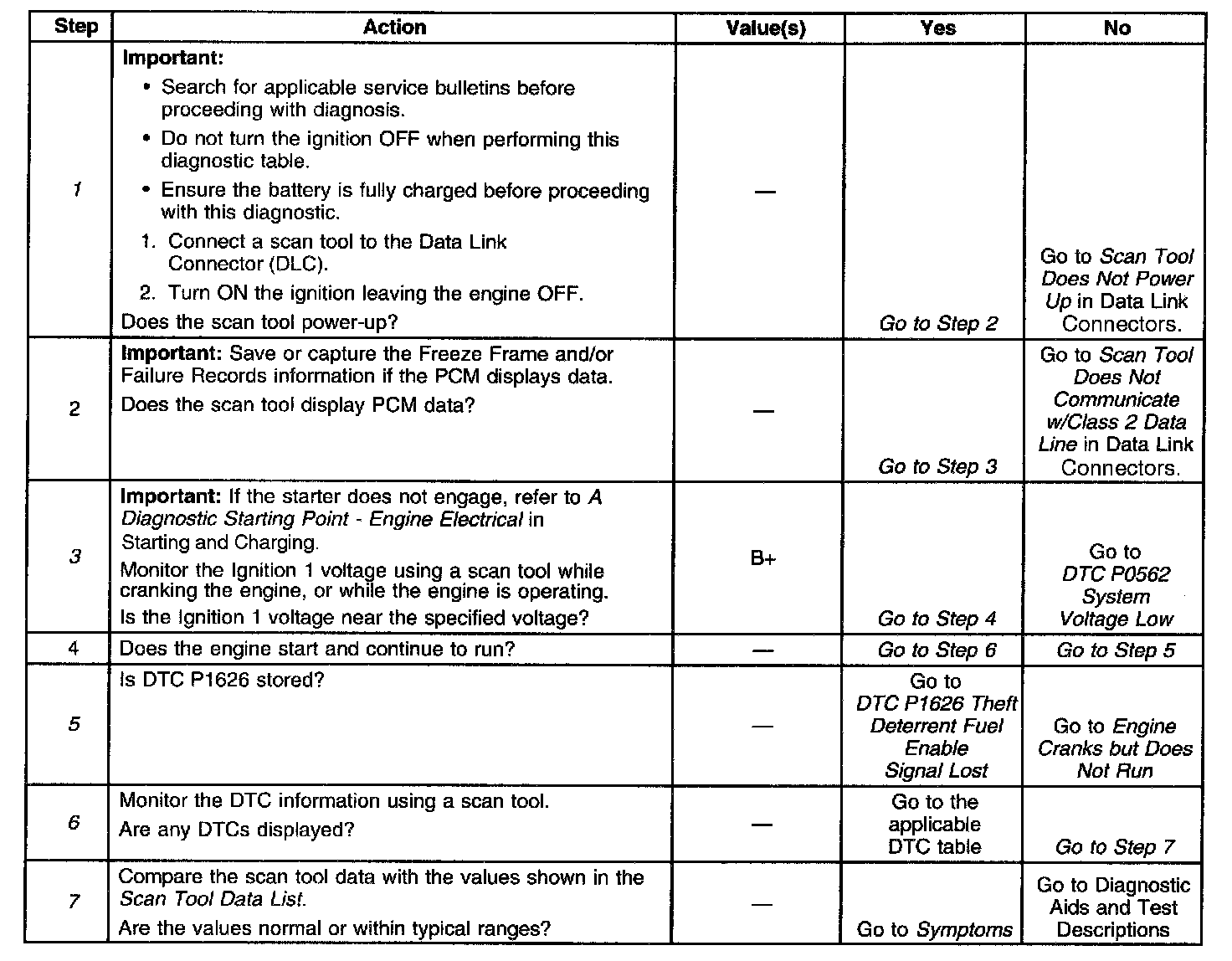The Powertrain OBD System Check is an organized approach to identifying a problem created by an electronic engine control system malfunction. The Powertrain OBD System Check is the starting point for any driveability concern diagnosis. The Powertrain OBD System Check directs the service technician to the next logical step in diagnosing a concern. Understanding and using the table correctly will reduce the diagnostic time and prevent the replacement of good pans.