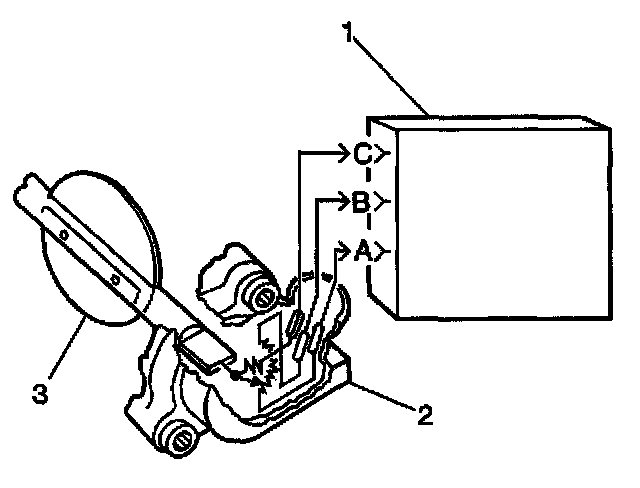 The Throttle Position (TP) sensor (2) is a potentiometer. The TP sensor is connected to the throttle shaft (3) on the throttle body. The PCM (1) calculates throttle position by monitoring the voltage on the signal line. The TP sensor signal changes as the throttle valve angle is changed (accelerator pedal moved). The TP sensor signal voltage is low at a closed throttle position. The TP sensor signal voltage increases as the throttle valve opens so that at Wide Open Throttle (WOT), the output voltage should be above 4.0 volts.