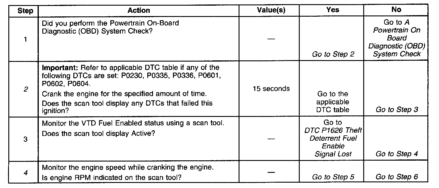 The Engine Cranks but Does Not Run diagnostic table assumes that battery condition and engine cranking speed are OK. If the battery condition and the cranking speed are not OK, refer to Engine Cranks/Cranks Slowly, but Does Not Start in Starting and Charging for diagnosis. Make sure that there is adequate fuel in the tank. Testing and Inspection