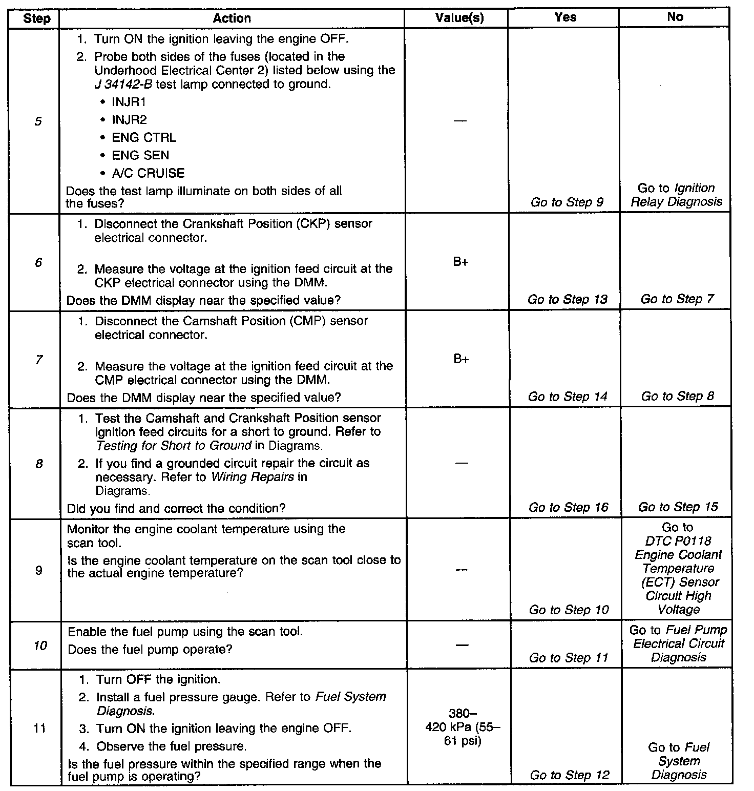 5. This step verities the IGN relay for proper operation. The IGN relay supplies voltage to the injectors and the ignition coils. When the IGN relay is not operating properly, a no start condition occurs. If the test lamp does not illuminate, this indicates the IGN relay is not suppling a voltage to the fuses.