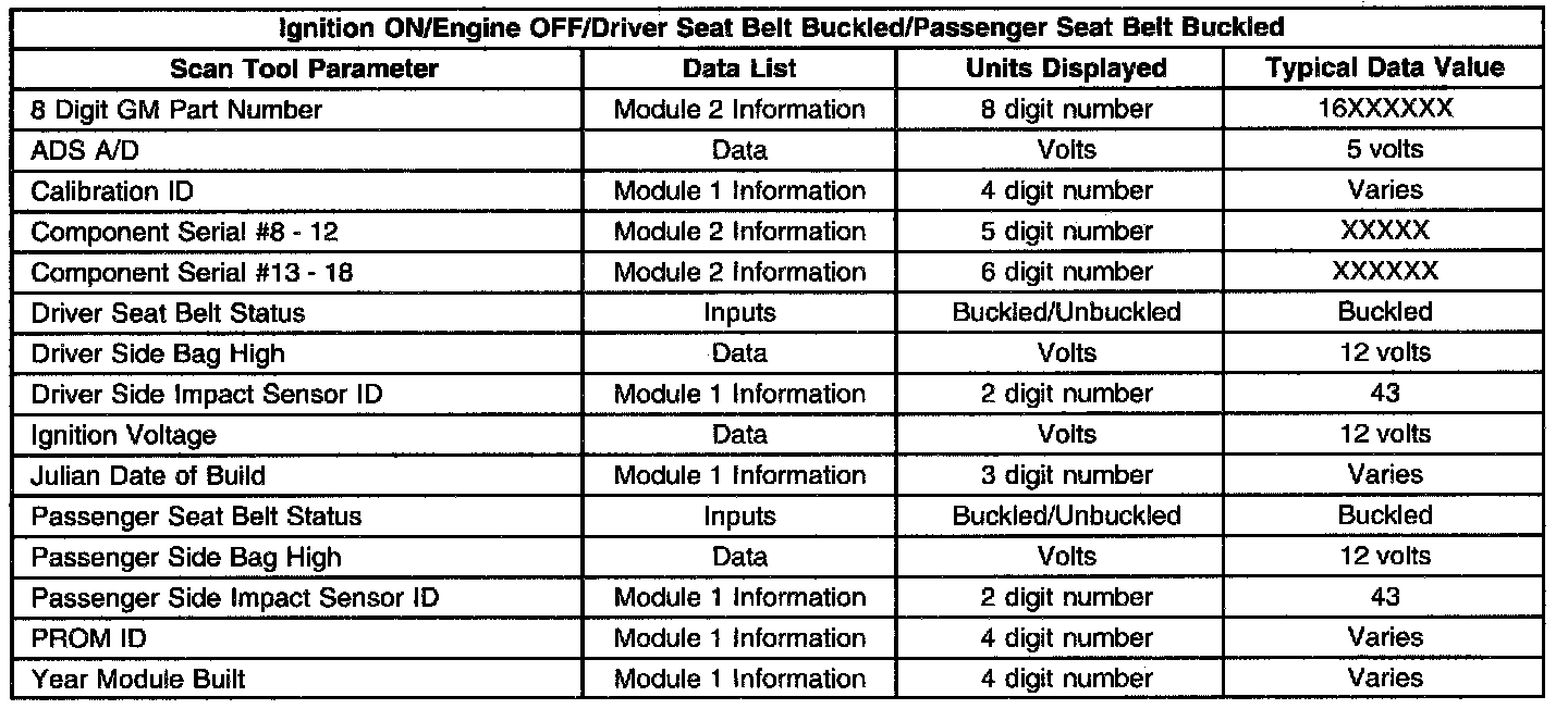 The SIR Scan Tool Data List contains all the restraint system related parameters that are available on the scan tool. The parameters in the list are arranged in alphabetical order. The column, "Data List," indicates the location of the parameter within the scan tool menu selections.
