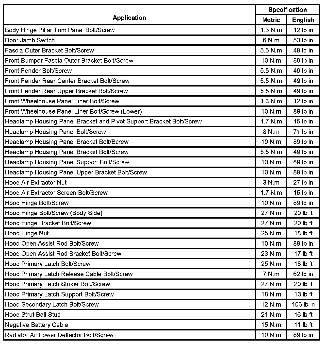 Fastener Tightening Specifications