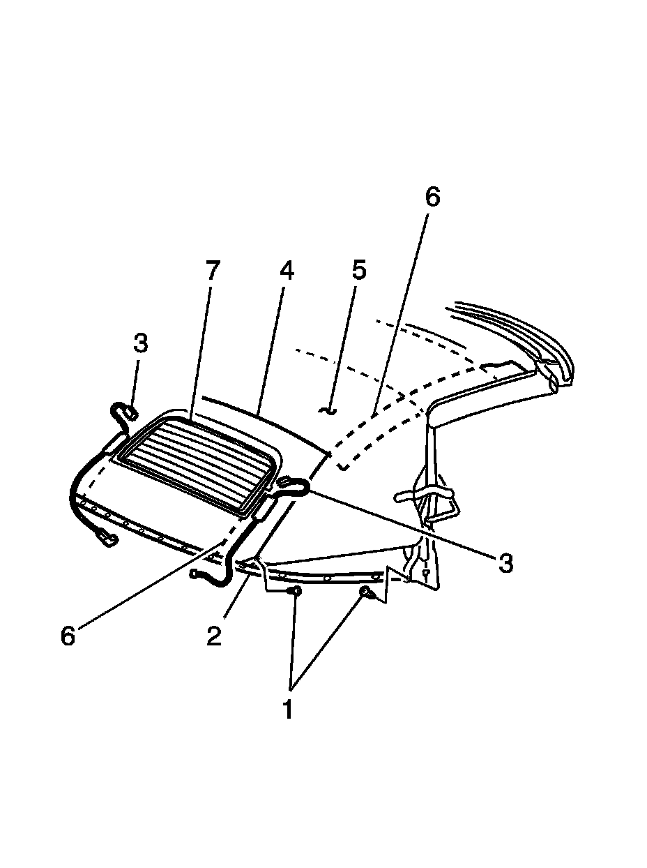8. Remove the bolt/screw attaching the rear window assembly (7) to the number 4 bow assembly (4).