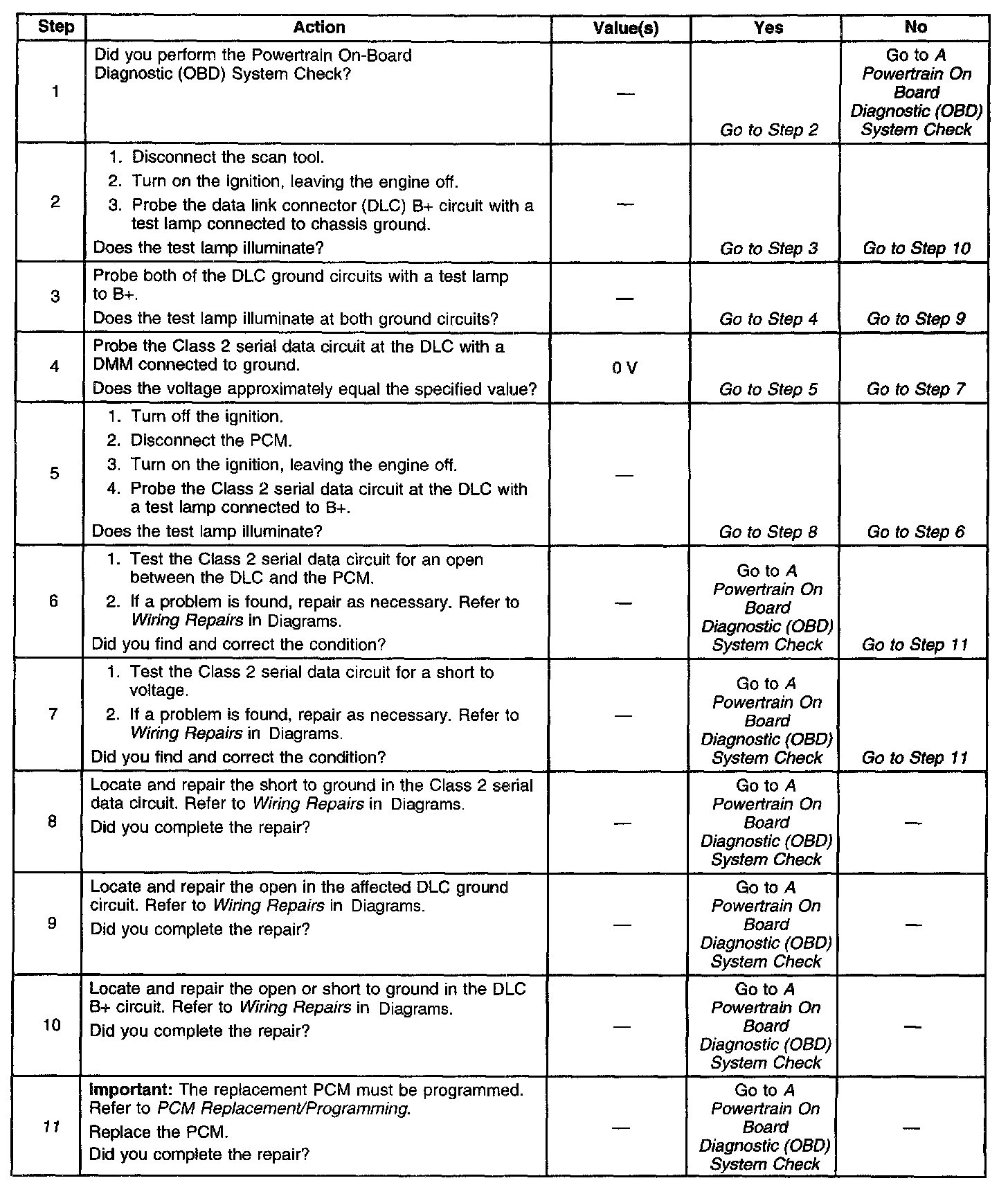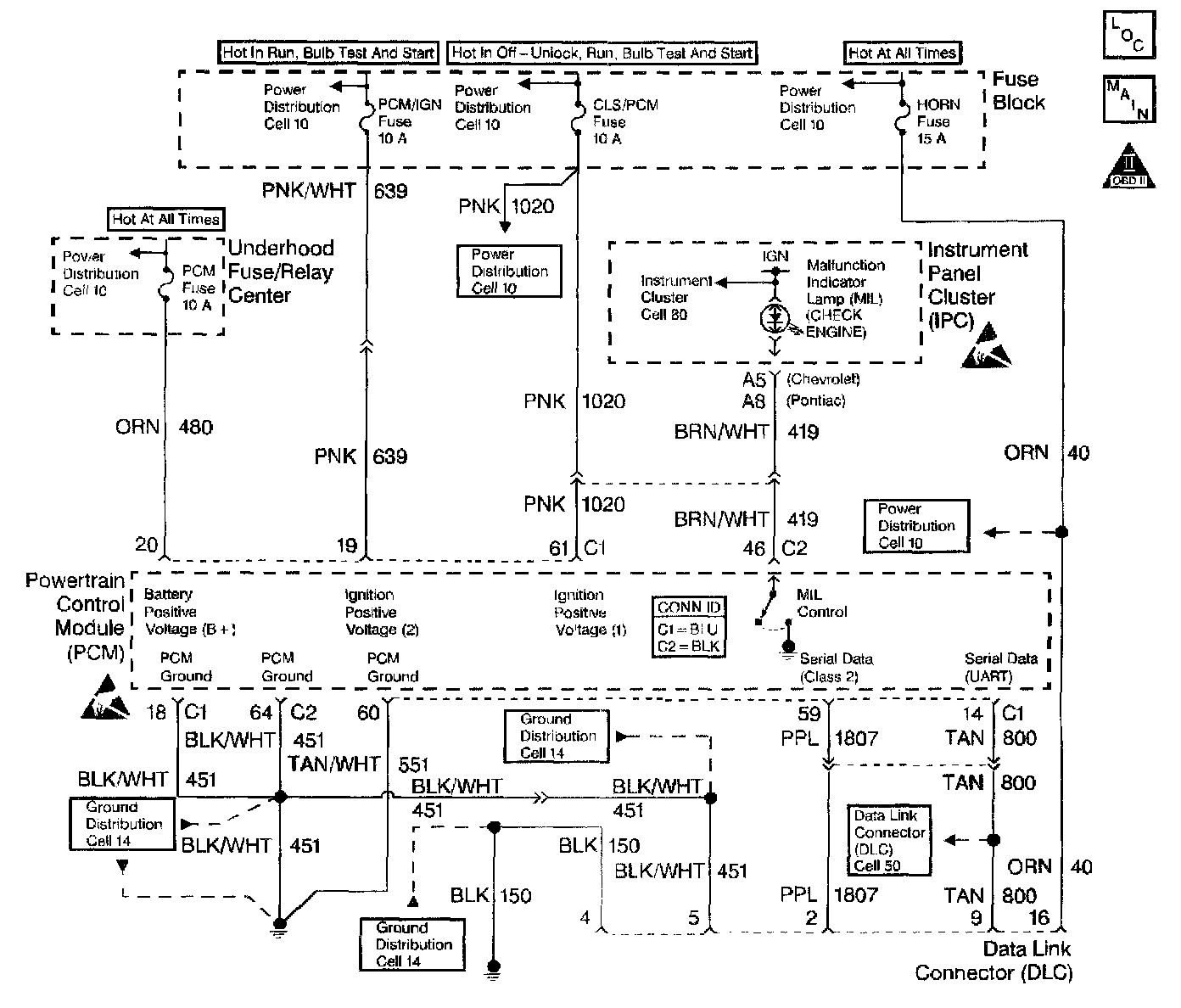 Battery power and ground is supplied for the scan tool through the DLC. The Class 2 serial data circuit to the DLC allows the PCM to communicate with the scan tool. A UART serial data line is used to communicate with other modules such as the Electronic Brake Control Module (EBCM), the Supplemental Inflatable Restraint (SIR) system and the Instrument Panel Cluster (IPC).
