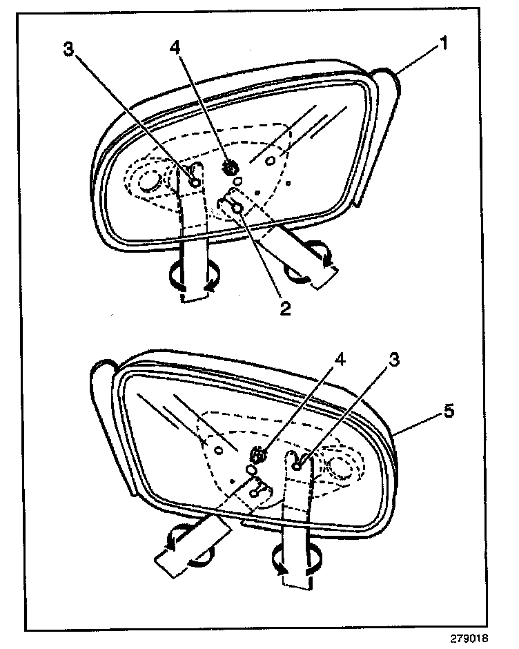 3. Press the mirror glass assembly at the outer jack screw (3) in order to snap the mirror (5) into position.