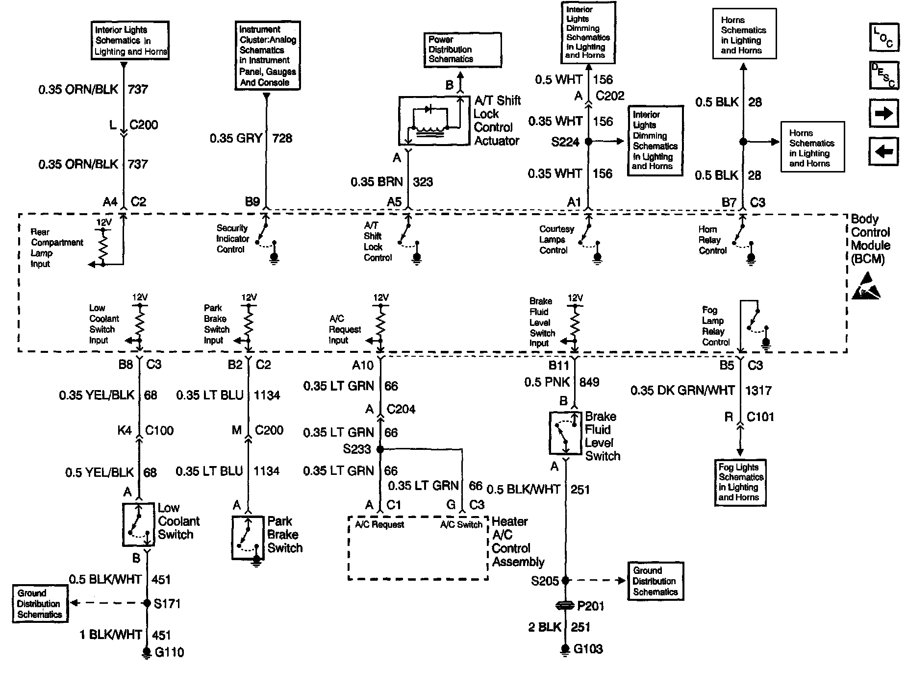 Body Control Module Schematics: Park Brake Switch, Low Coolant Switch, and Brake Fluid Level Switch: