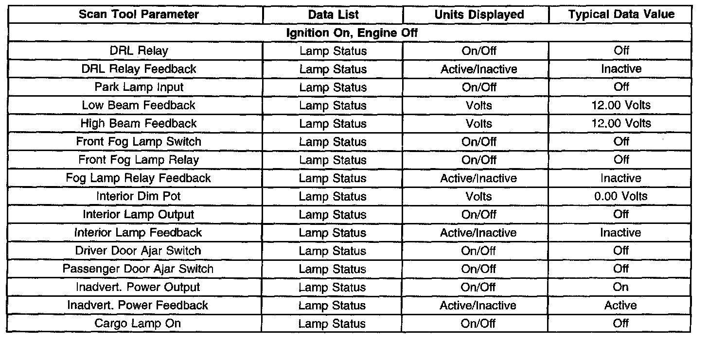 Use the Scan Tool Data Display Values and Definitions Information in order to assist in diagnosing vehicle malfunctions. Compare the vehicles actual scan tool data with the typical data display value table information. Use the data information in order to aid in understanding the nature of the problem when the vehicle does not match with the typical data display values.