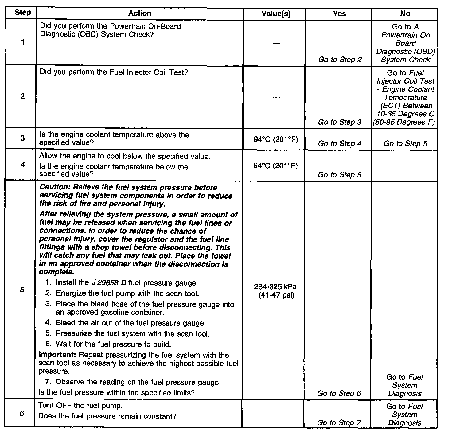 4. The engine coolant temperature must be below the operating temperature in order to avoid irregular fuel pressure readings due to hot soak fuel boiling.