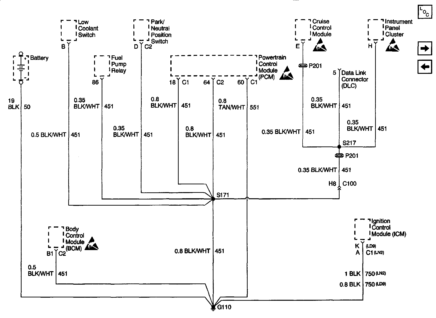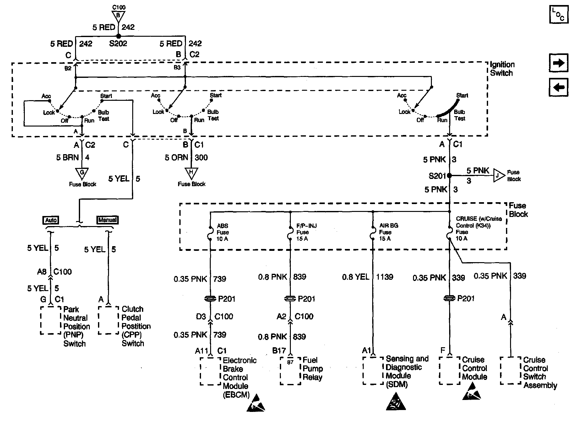 Power Distribution Schematics: Ignition Switch, F/P - INJ, SIR, CRUISE, and ABS Fuses: