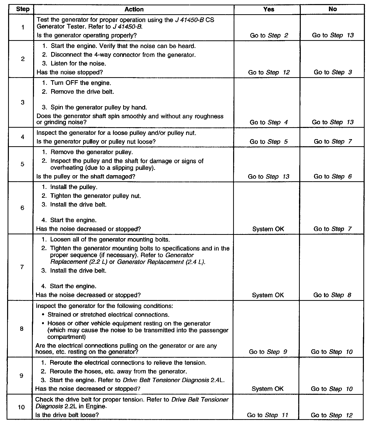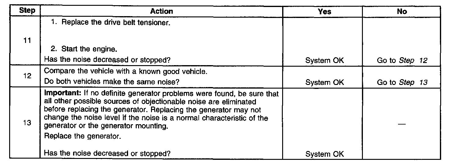 DIAGNOSTIC AIDSNoise from a generator may be due to electrical or mechanical noise Electrical noise (magnetic whine) usually varies with the electrical load placed on the generator and is a normal operating characteristic of all generators. When diagnosing a noisy generator, it is important to remember that loose or misaligned components around the generator may transmit the noise into the passenger compartment and that replacing the generator may not solve the problem.