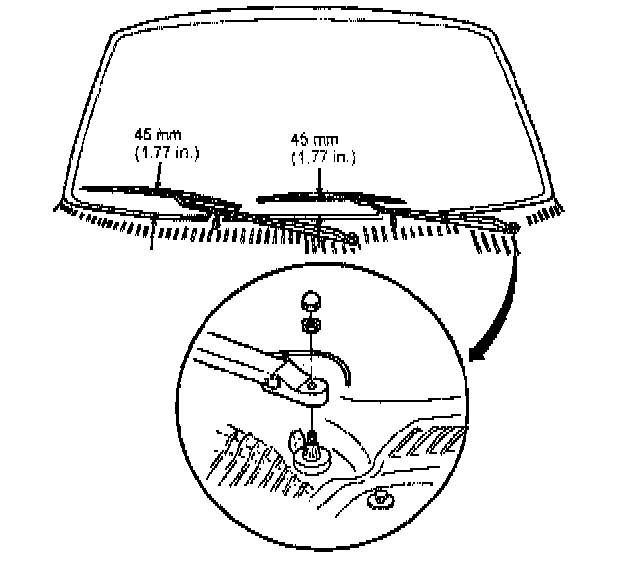 1. Install the wiper arm onto the wiper transmission drive shaft while maintaining a distance of 45 mm (1.77 in) between the wiper blade and the bottom of the windshield.