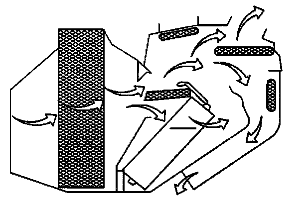 ^ Warmer air is directed through the lower ducts to the floor area.