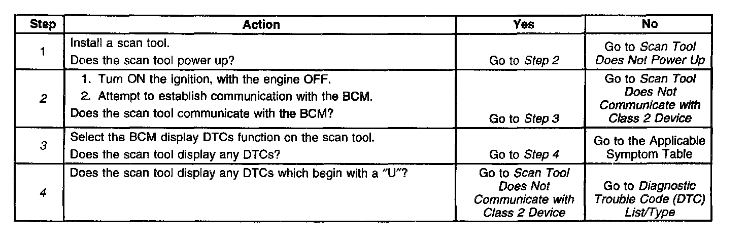 2. Tests if the BCM is able to communicate. Lack of communication may be due to a partial malfunction of the class 2 serial data circuit or due to a total malfunction of the class 2 serial data circuit. The specified procedure will determine the particular condition.