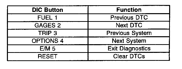 The manual display feature allows you to manually select each module DTC display function. The manual mode will automatically be entered after the automatic DTC display sequence is complete, or can be entered at any time during the automatic mode by pressing any button on the DISC except the E/M 5 (E/M 5 button is used to exit the DIAGNOSTIC mode at any time). When the manual mode is selected, the IPC will display the MANUAL DIAGNOSTICS mode message for 2 seconds, or until any button on the DISC except the E/M 5 is pressed. After the MANUAL DIAGNOSTICS mode message is displayed, the IPC will display the first system abbreviation and quantity of codes stored for that system, then the IPC will wait for further instructions. The buttons on the DISC provide the following functions when operating the on-board diagnostic feature in the manual mode:DIC Button Functions: