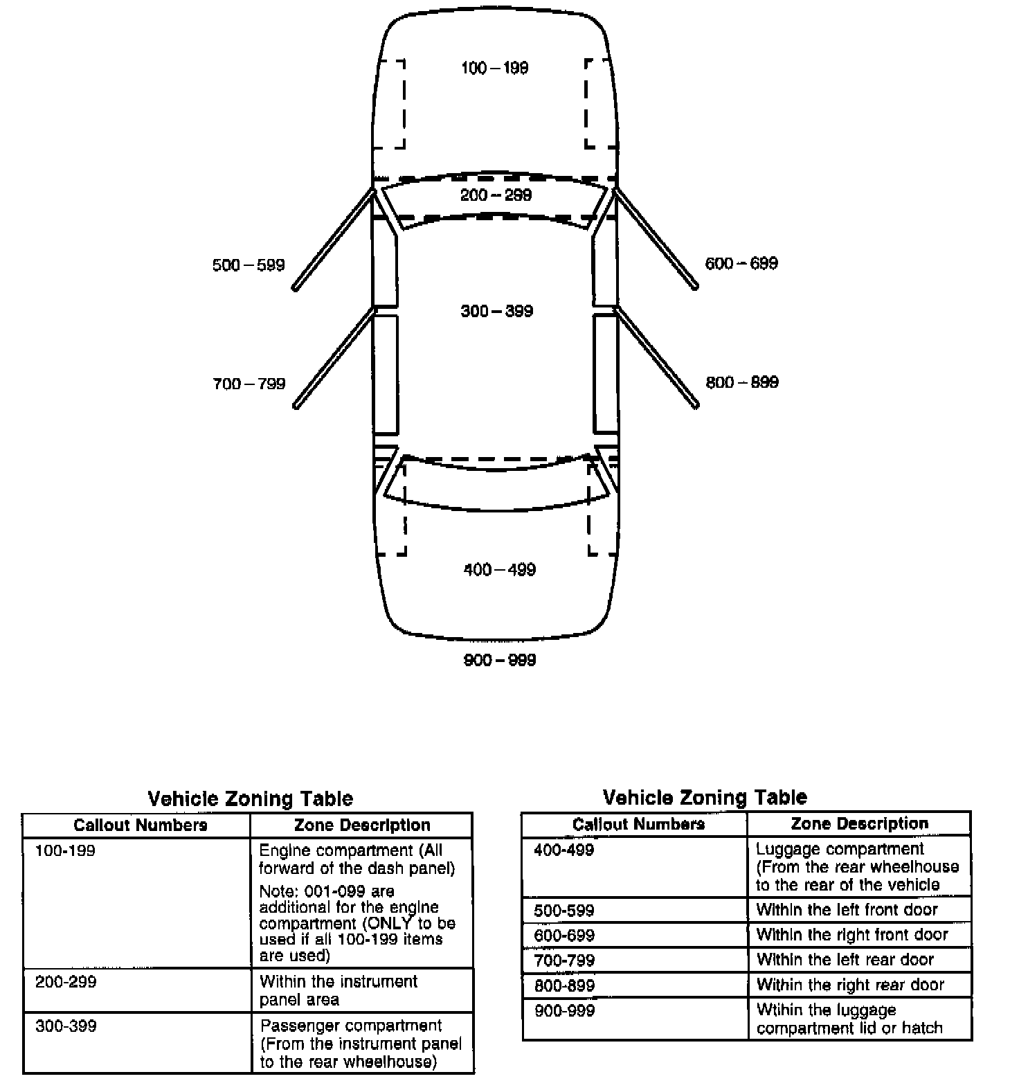 All grounds, in-line connectors, pass-through grommets, and splices have identifying numbers that correspond to where they are located in the vehicle. The