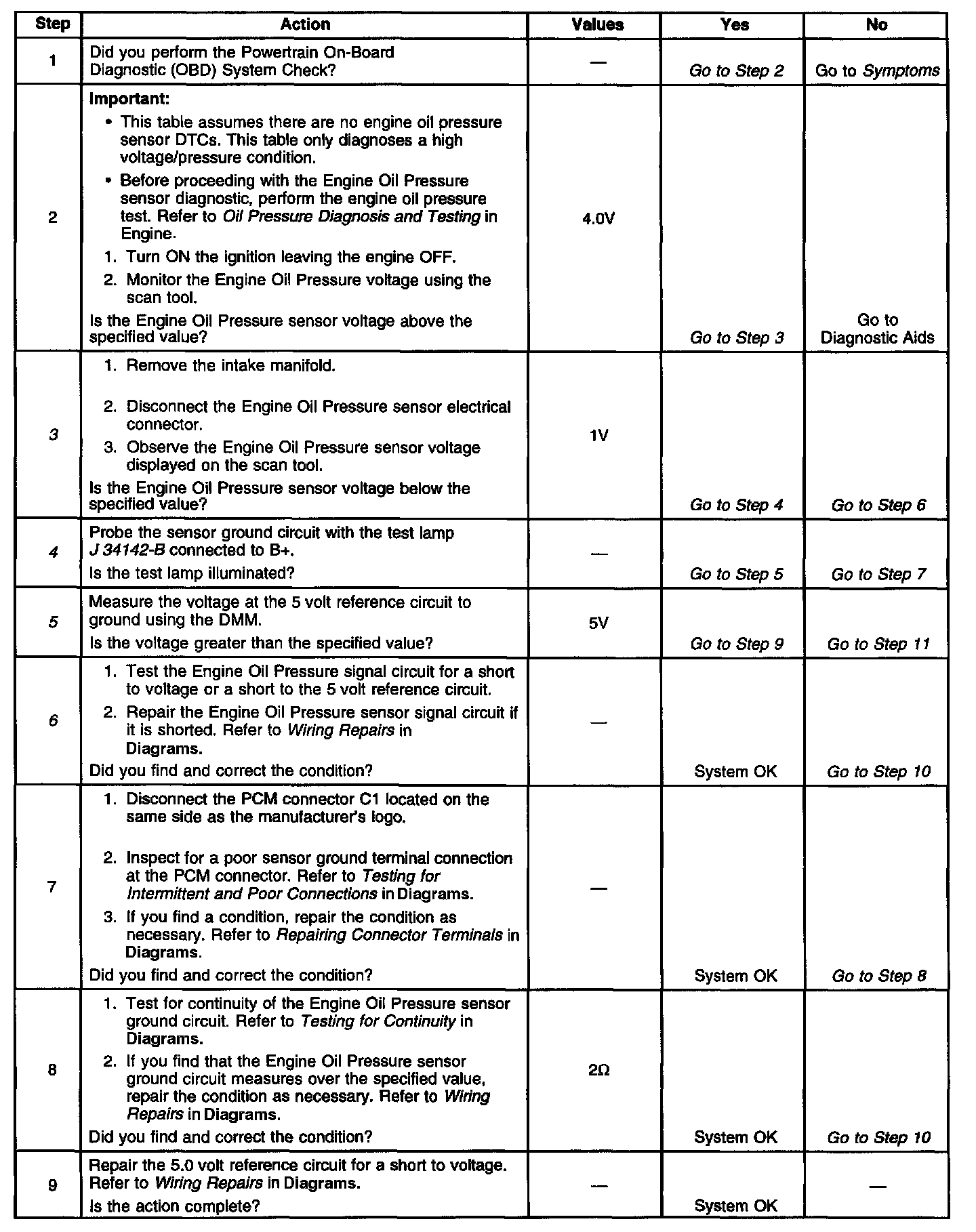 6. This step verifies if a ground circuit is available at the Engine Oil Pressure sensor.