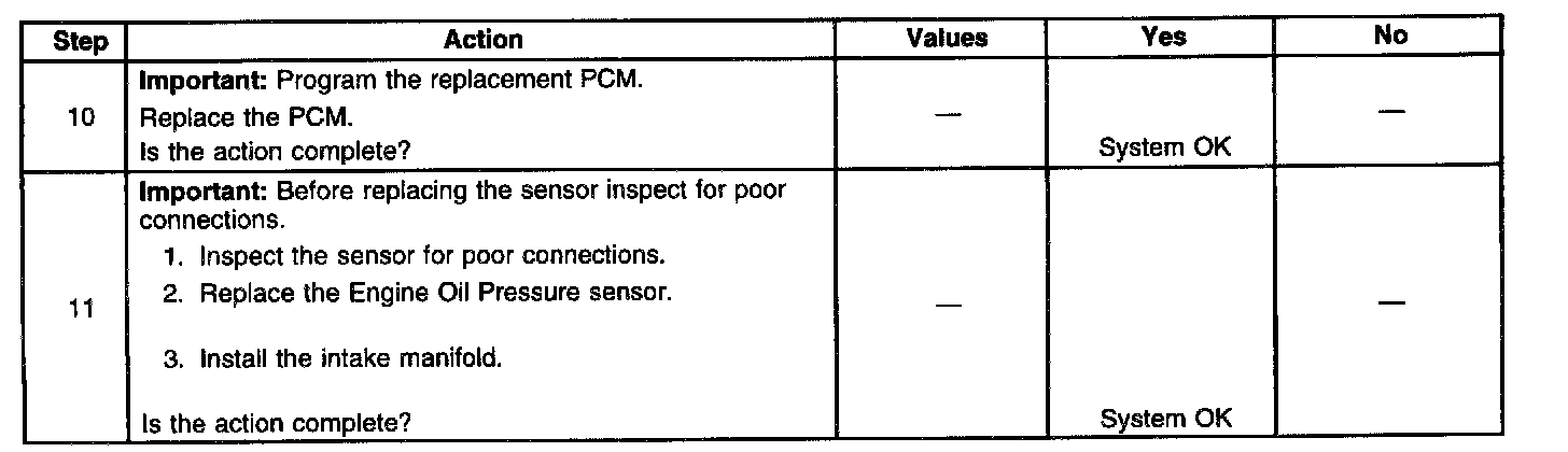 The EOP sensor changes resistance based on changes in engine oil pressure. The PCM sends the engine oil pressure sensor information to the Instrument Panel Cluster (IPC) via the class 2 circuit. When the EOP is out of range the Driver Information Center (DIC) displays a message.