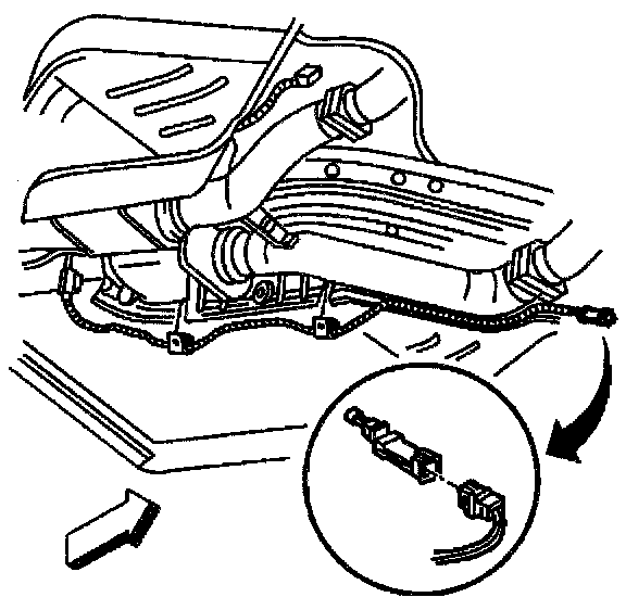 REMOVAL PROCEDURE (BANK 2 SENSOR 2)NOTE: The heated oxygen sensors each use a permanently attached pigtail and connector. Do not remove the pigtail from the heated oxygen sensor. Damage or removal of the pigtail or the connector affects proper operation of the heated oxygen sensor. Handle the oxygen sensor carefully. Do not drop the oxygen sensor. Keep the in-line connector and the louvered end free of grease, dirt, or other contaminants. Do not use cleaning solvents of any type. Do not repair the wiring, the connector, or the terminals. Replace the oxygen sensor if the pigtail wiring, the terminals, or the connector is damaged. Proper oxygen sensor operation requires an external air reference. This external air reference is obtained by way of the oxygen sensor signal and heater wires. Any attempt to repair the wires, the connectors, or the terminals results in the obstruction of the air reference and degrades the oxygen sensor performance. A dropped oxygen sensor is a bad oxygen sensor.