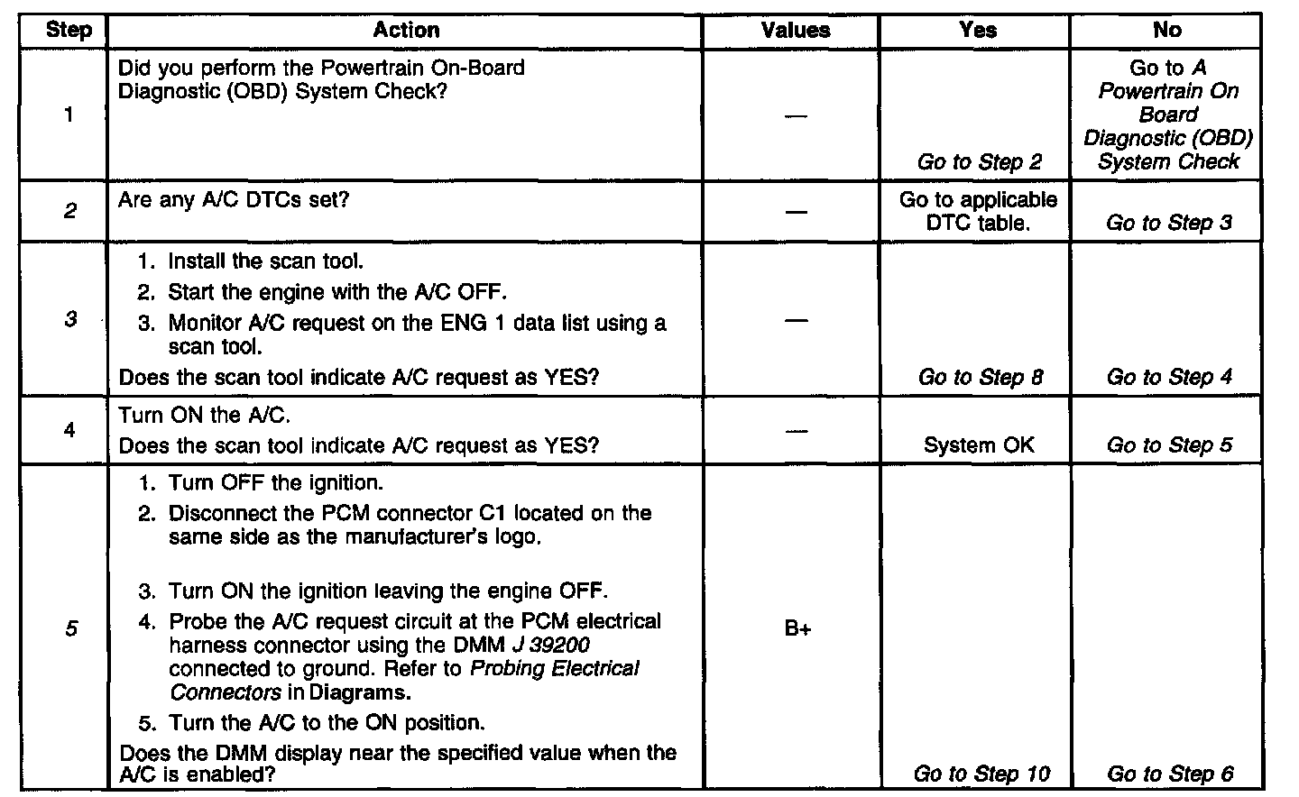 ^ Before using this table, be sure no PCM DTCs are stored. The PCM will not activate the A/C clutch with certain DTCs set.