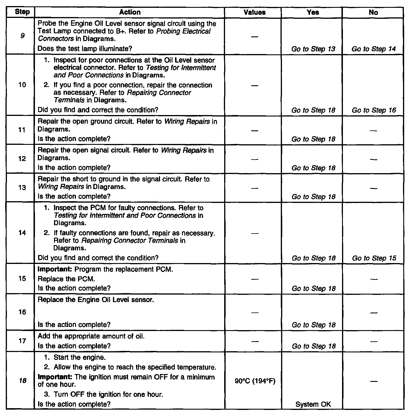 9. This steps tests the Oil Level signal circuit for a short to ground.