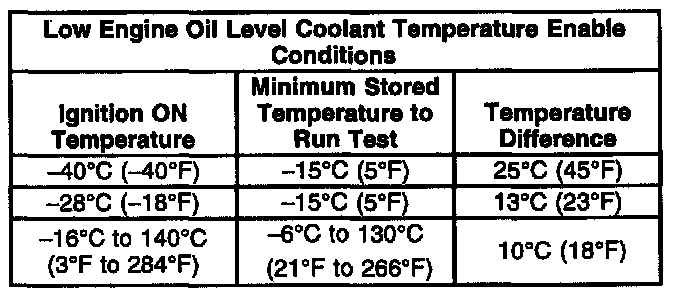 ^ If the PCM determines the Ignition ON engine coolant temperature is cooler then Ignition OFF engine coolant temperature by a predetermined amount, the PCM tests the Engine Oil Level sensor circuit. The following table illustrates the required temperatures to enable the Engine Oil Level test: