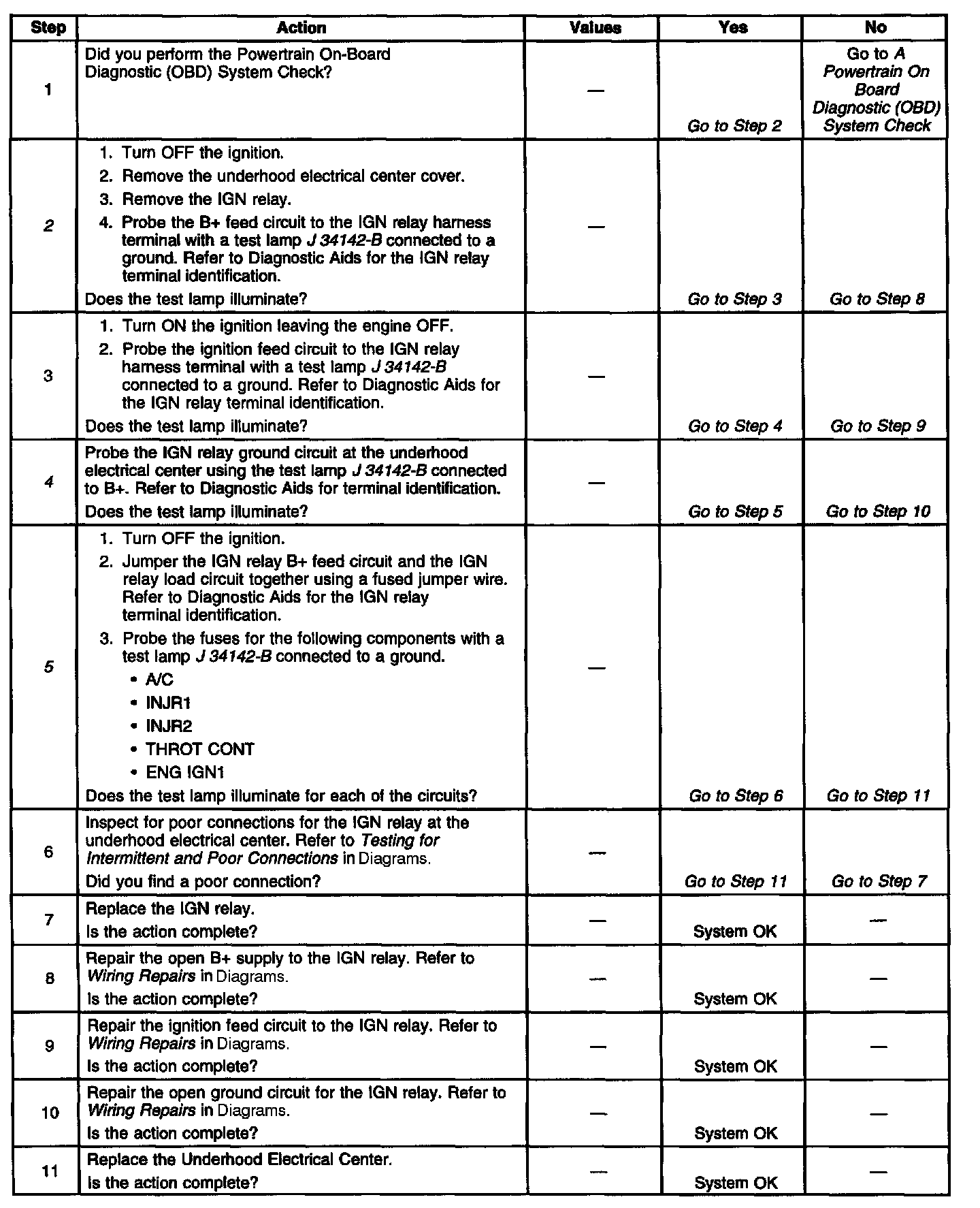 5. This step isolates the circuit from the IGN relay. All of the circuits at the relay are good if the test lamp illuminates.