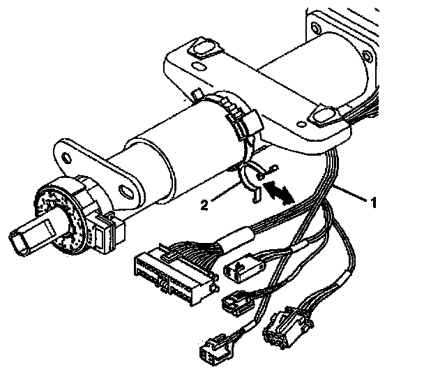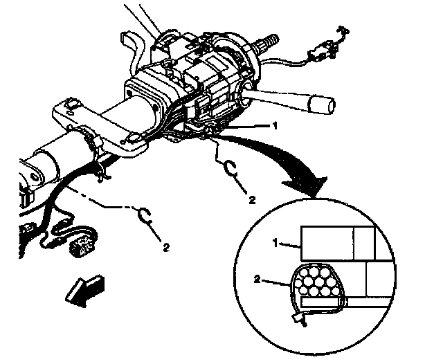 2. Remove the wire harness straps (2) from the steering column tilt head assembly (1) and the column.