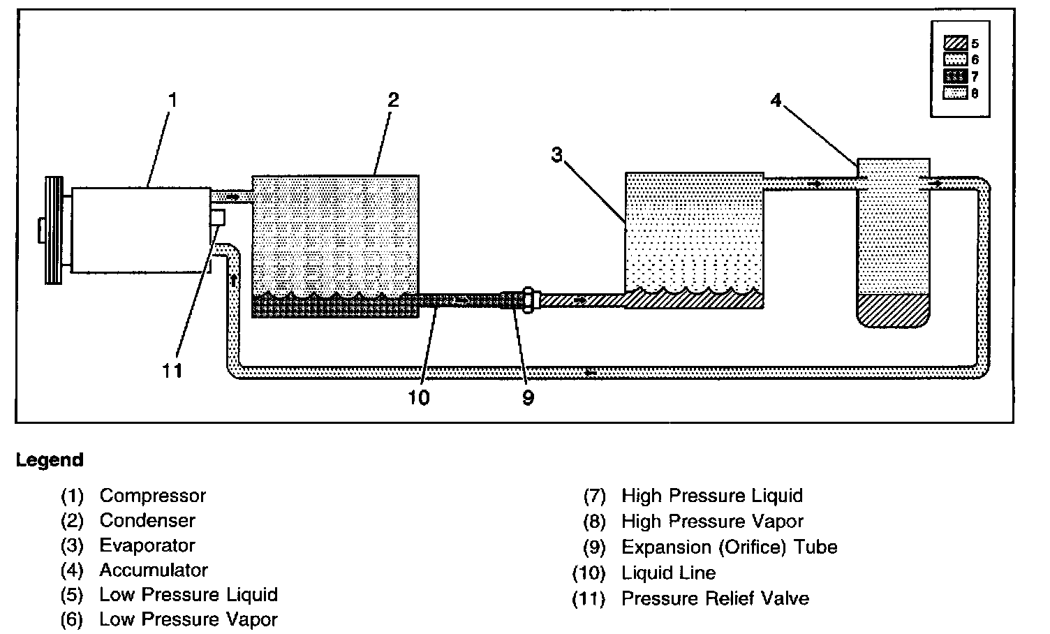 The Variable Displacement Orifice Tube (VDOT) refrigeration system is comprised of a variable displacement compressor and a fixed expansion (orifice) tube. This system can match the air conditioning demands under all conditions without cycling. When the A/C capacity demand is high, the suction pressure will be above the control point; a control valve will bleed discharge gas into the compressor crankcase and close off a passage from the compressor crankcase to the suction plenum. Depending on engine usage, the compressor is cut off. Following are some examples of conditions resulting in compressor cutoff: