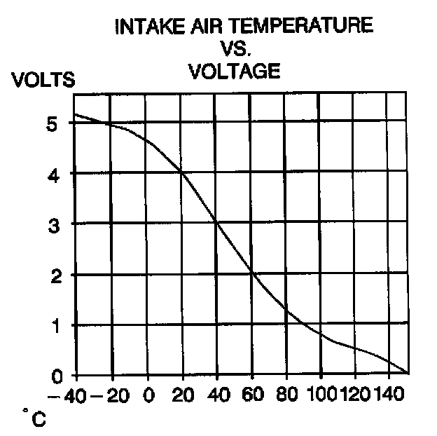 The Intake Air Temperature (IAT) sensor is a thermistor which changes value based on the temperature of air entering the engine. Low temperature produces a high resistance (100,000 ohms at -40°C/-40°F), while high temperature causes low resistance (70 ohms at 130°C/266°F).The PCM supplies a 5.0 volt signal to the sensor through a resistor in the PCM and measures the voltage. The voltage will be high when the incoming air is cold, and low when the air is hot. By measuring the voltage, the PCM calculates the incoming air temperature. The IAT sensor signal is used to adjust spark timing according to incoming air density.