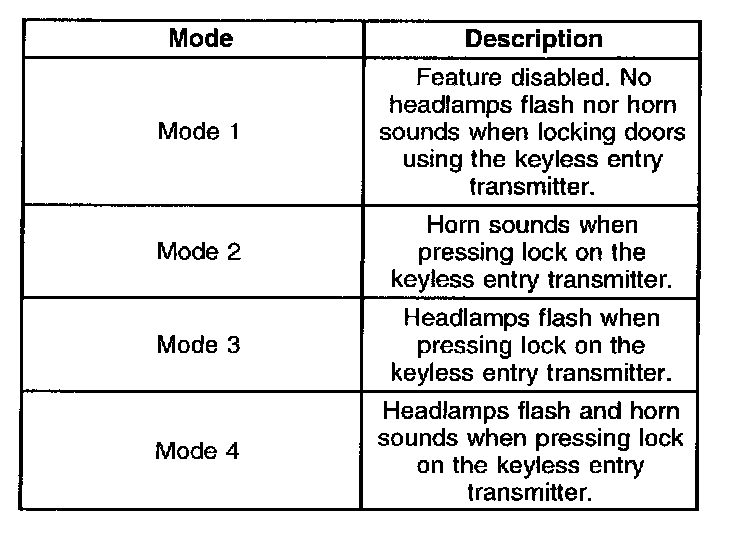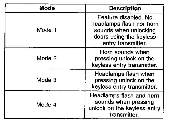 ^ The BCM sounds the chime a number of times equivalent to the remote unlock verification mode. A transition past mode 4 repeats the sequence starting with mode 1.