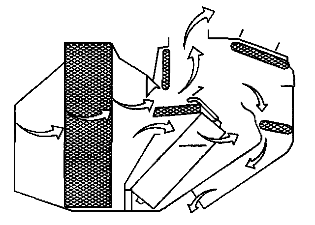 Most of the air flows through the floor outlets. A small amount of air flows through the defroster duct.