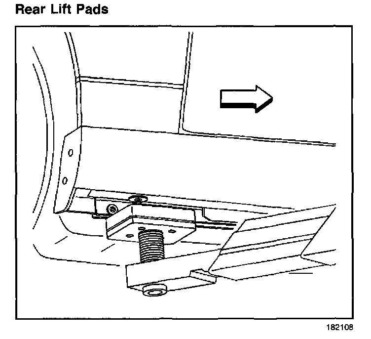 When lifting the vehicle with a frame-contact lift, place the rear lift pads at the rear pinchweld flanges.