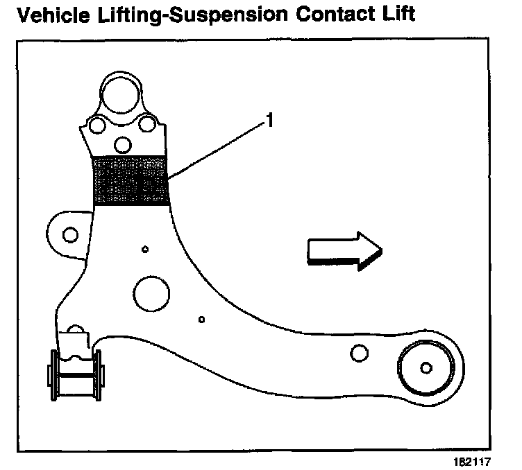When lifting the vehicle with a suspension-contact lift, place the front post lift points at the lower control arms in the area shown (1). Lift the rear of the vehicle with the rear post lift points ONLY under the rear wheels.