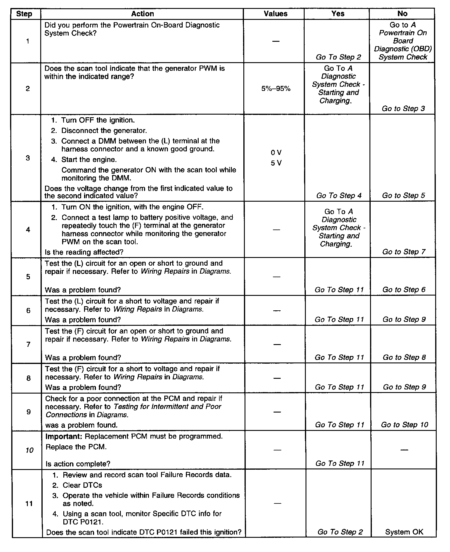 ^ Damaged harness - Inspect the wiring harness for damage. If the harness appears to be OK, disconnect the PCM, turn the ignition on and observe voltmeter connected to the Generator circuits at the PCM harness connector while moving connectors and wiring harnesses related to the Generator control circuit. A change in voltage will indicate the location of the fault. Refer to Connector Repairs and Wiring Repairs in Diagrams.